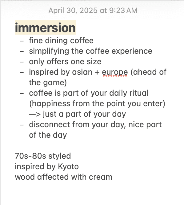 One of my biggest takeaways is the power of acquiring information straight from the source. Visiting Immersion’s cafes and speaking with Birtain helped me understand the brand essence more deeply, informing me of how to design the tone and nuances of the website.