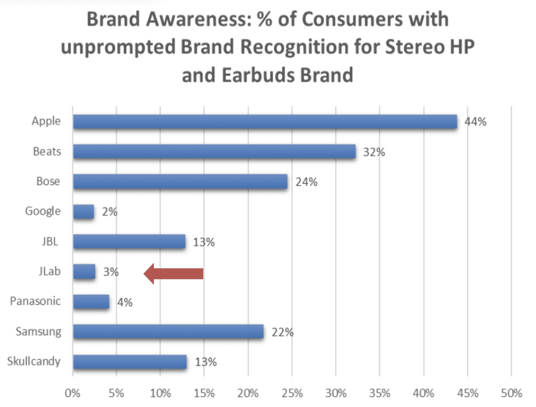 I identified that one JLab’s main challenges was brand awareness, specifically in the “Awareness” stage of the customer journey. “JLab” was only mentioned unprompted by 26 out of 1000 people. With these insights in mind, we decided to explore brand growth strategies with a clearer understanding on the scope of the project.